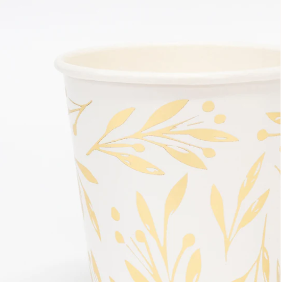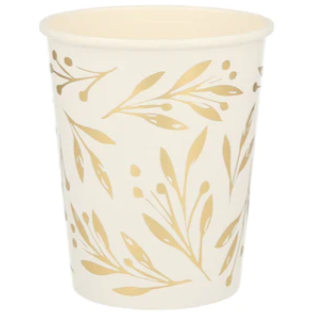 Eleganti bicchieri in cartoncino con foglie oro, perfetti per qualsiasi evento speciale! La confezione contiene 8 bicchieri in cartoncino eco friendly con disegni in lamina d’oro brillante.