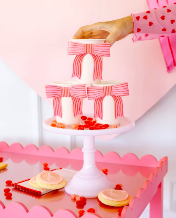 8 meravigliosi bicchieri in cartoncino rosa pastello con fiocchetto a righe, perfetto per festeggiare San Valentino o qualsiasi occasione speciale! Altezza 11,4 cm.