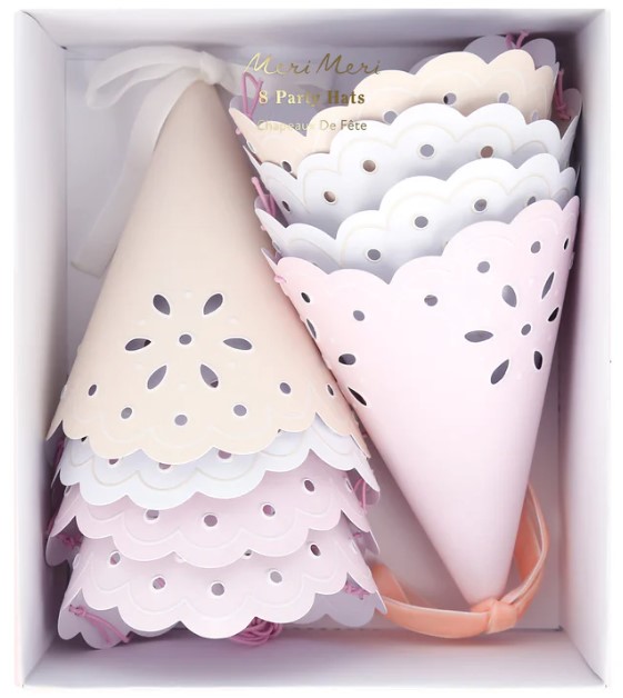 8 splendidi cappellini che si ispirano al design in pizzo Broderie Anglaise con dettagli unici in 3 splendide tonalità pastello ed eleganti fiocchi in velluto, perfetti per un party da principessa! Adatti per età 3+
