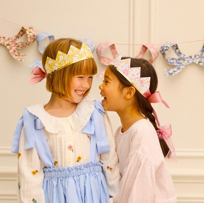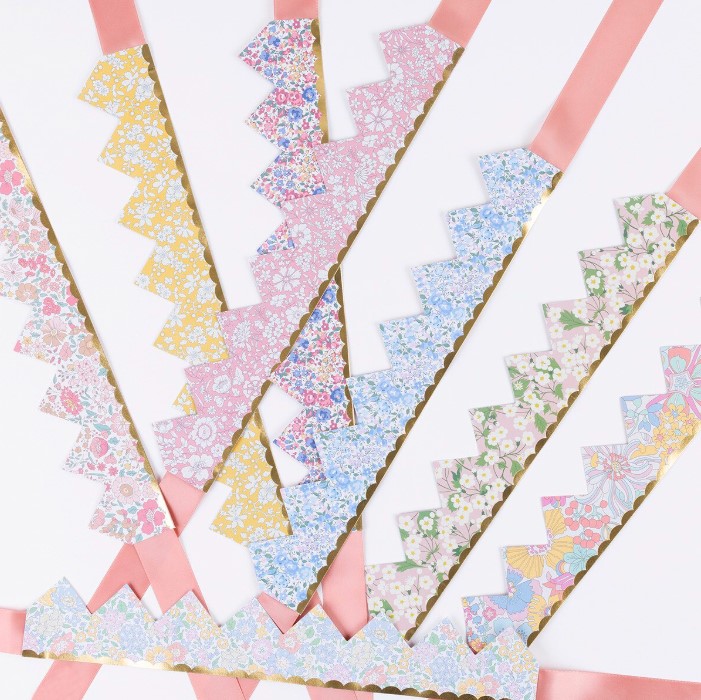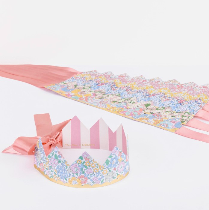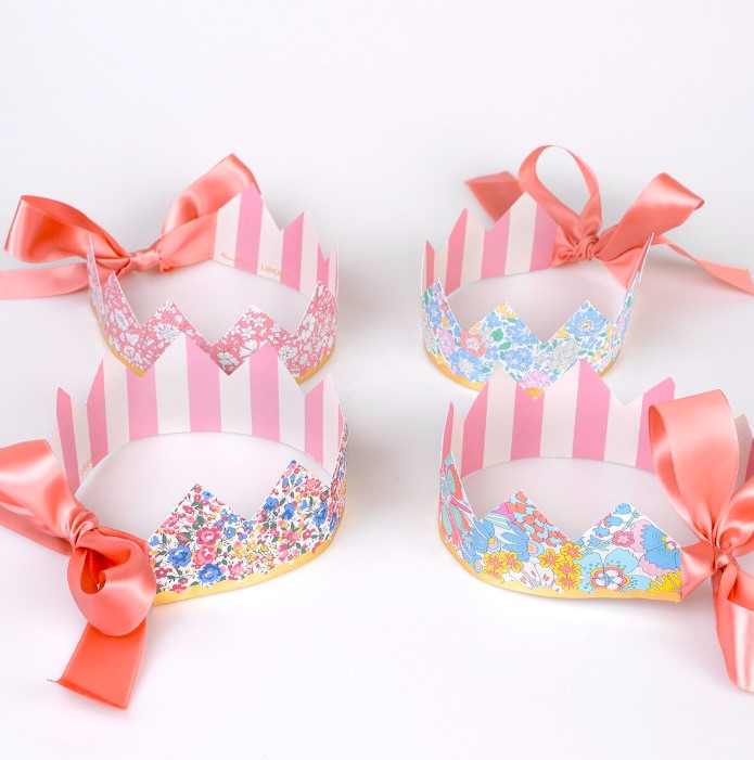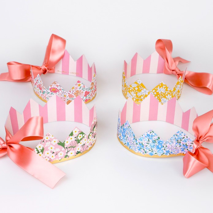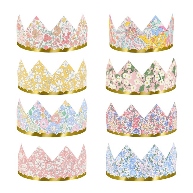 8 meravigliose coroncine in carta con 8 fantasie floreali Liberty e nastro in raso rosa antico, perfette per aggiungere un tocco di eleganza ad un party a tema principesse o qualsiasi evento primaverile! Adatte sia per bambini dai 3 anni in su che per adulti.