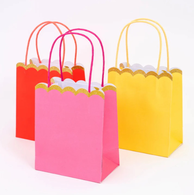 8 Incredibili Party Bags in otto colori diversi, rifinite con scintillanti glitter dorati e manici di carta intrecciati. Sono perfette per qualsiasi evento speciale!