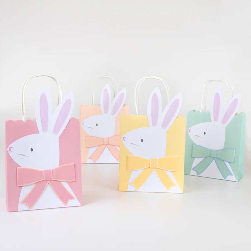 8 meravigliose party bags in 4 splendide tonalità pastello con dolcissimi coniglietti e fiocchetto, perfette per raccogliere le uova di Pasqua o per contenere i regalini per gli invitati! Dimensione 15,2 x 18,4 cm.