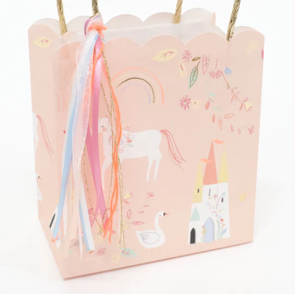 Le piccole principesse ed i principini saranno tristi che la festa sia finita, ma felici di andarsene con una di queste bellissime party bags che avrete riempito di dolcetti. Sono splendidamente illustrate con unicorni, castelli e cigni con una splendida nappa, bordo smerlato e manico dorato.