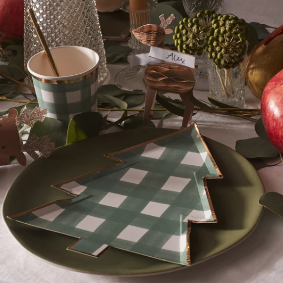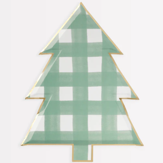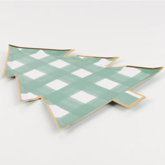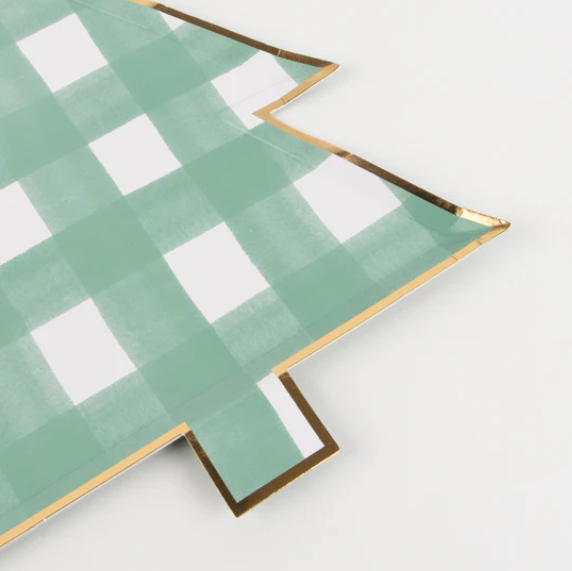 Splendidi piatti sagomati a forma di albero di Natale con un elegante design invernale a quadretti verdi e bianchi, saranno incredibili sul tuo tavolo da festa! La confezione contiene 8 piatti in cartoncino ecologico con un favoloso bordo in foglio d’oro per un effetto scintillante.