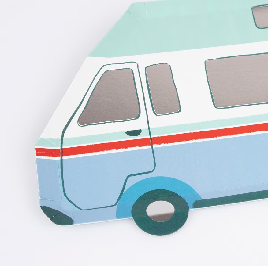 8 incredibili piatti in cartoncino a forma di camper, perfetti per un party a tema campeggio! Dimensione 25,4 x 17,8 cm.