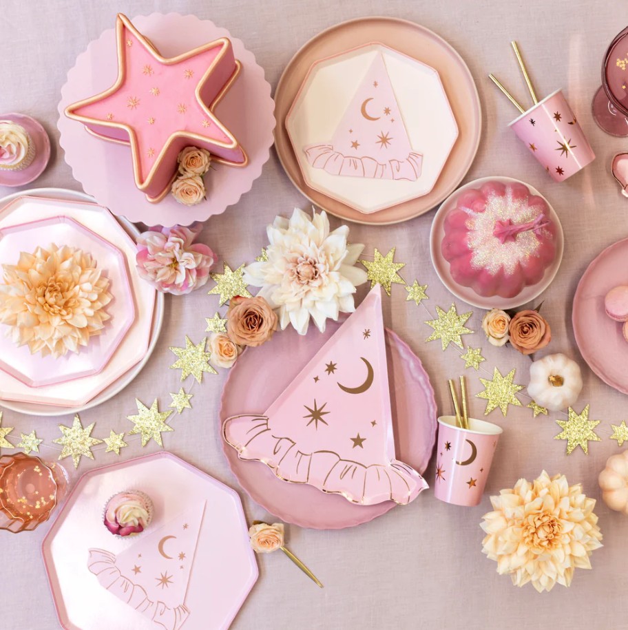 8 meravigliosi piatti in cartoncino a forma di cappello da strega rosa con dettagli oro, perfetti per aggiungere un tocco di eleganza alla tua tavola di Halloween!