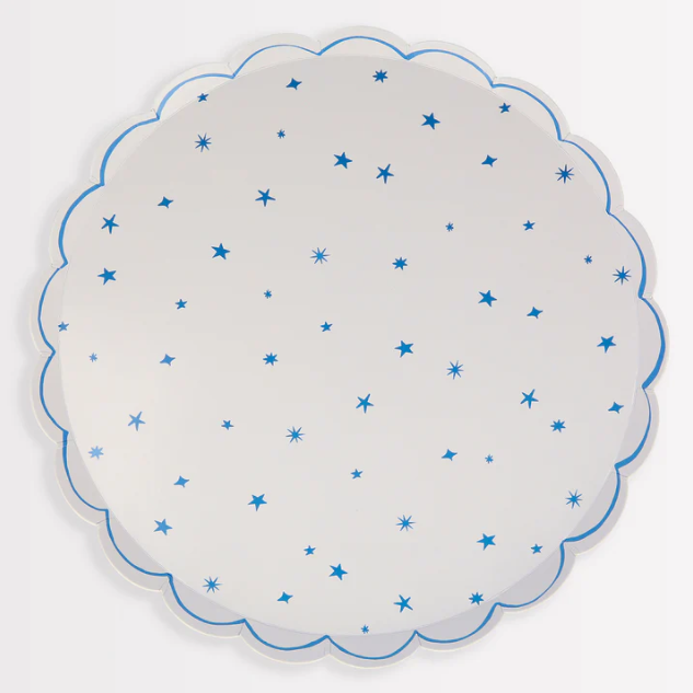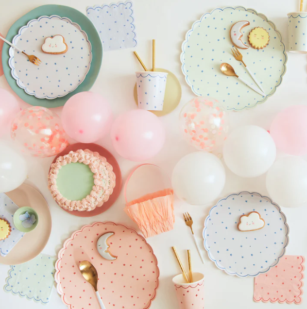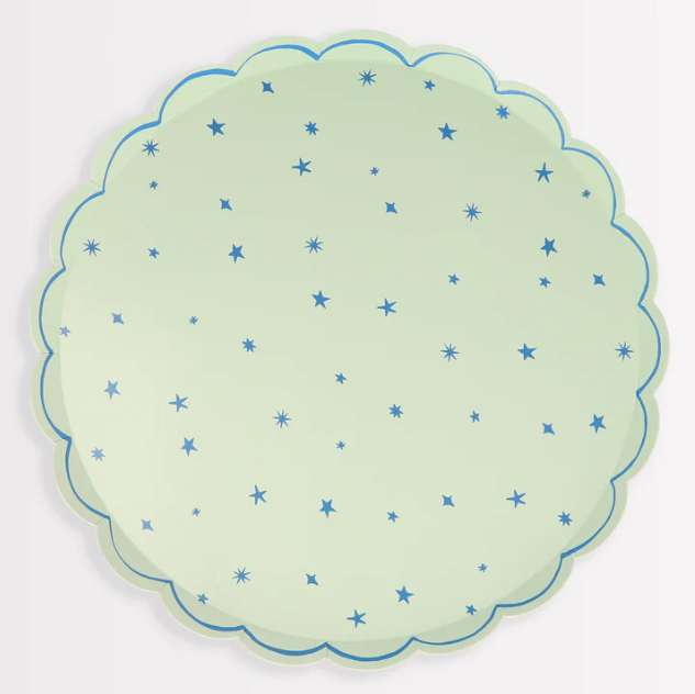 8 incredibili piatti con stelline rosa, blu e verde menta, realizzati con carta ecologica di alta qualità.