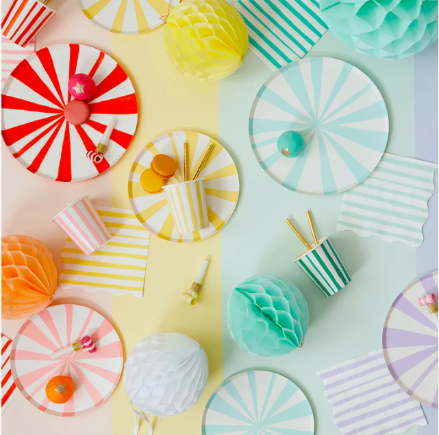 Incredibili piatti con strisce bianche e verde menta, perfetti per il tuo party super colorato e divertente! La confezione contiene 8 piatti in cartoncino eco-friendly diametro 26,7 cm.