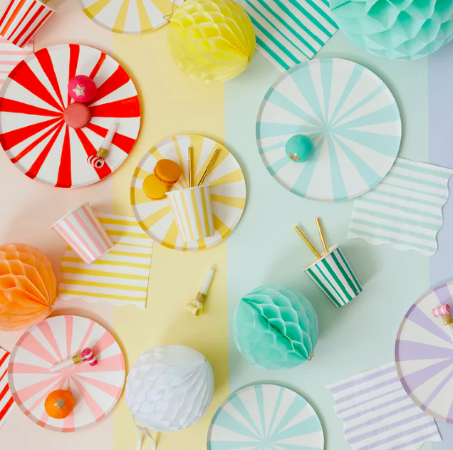 Incredibili piatti con strisce gialle e bianche, perfetti per il tuo party super colorato e divertente! La confezione contiene 8 piatti in cartoncino eco-friendly diametro 26,7 cm.