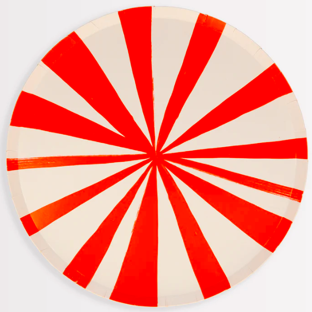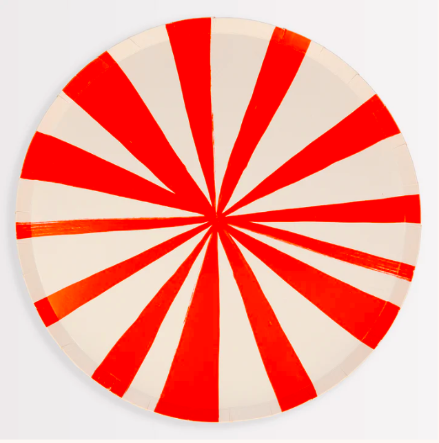 Incredibili piatti con strisce rosse e bianche, perfetti per il tuo party super colorato e divertente! La confezione contiene 8 piatti in cartoncino eco-friendly diametro 26,7 cm.
