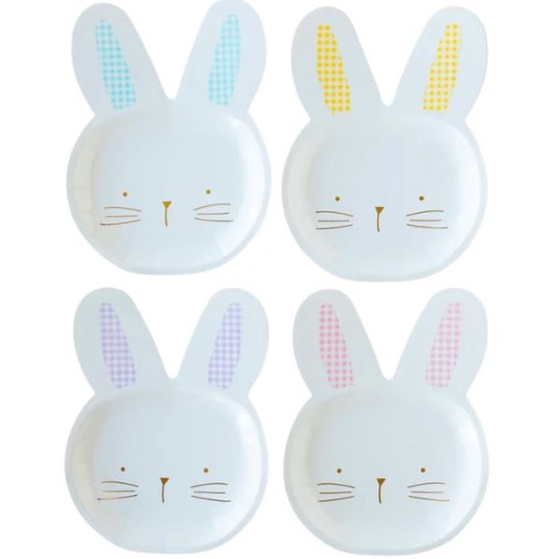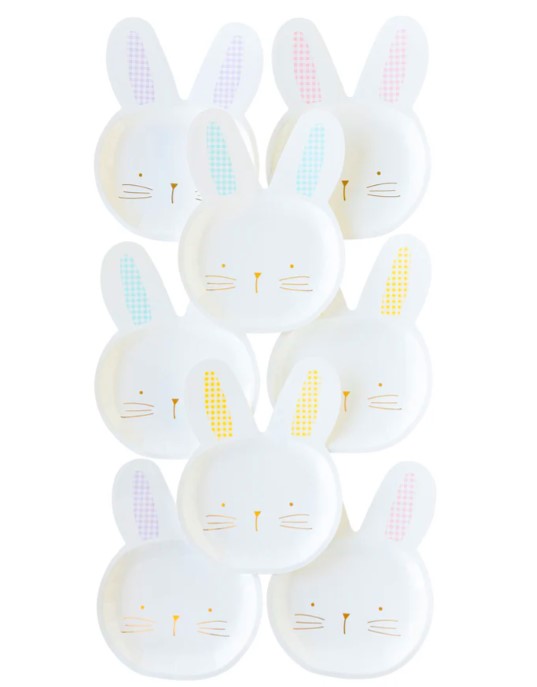 8 simpatici piatti in cartoncino a forma di coniglietti bianchi con orecchie a quadretti pastello e splendidi dettagli oro, perfetti per la tua tavola di Pasqua! Dimensione 22,8 x 30,4 cm.