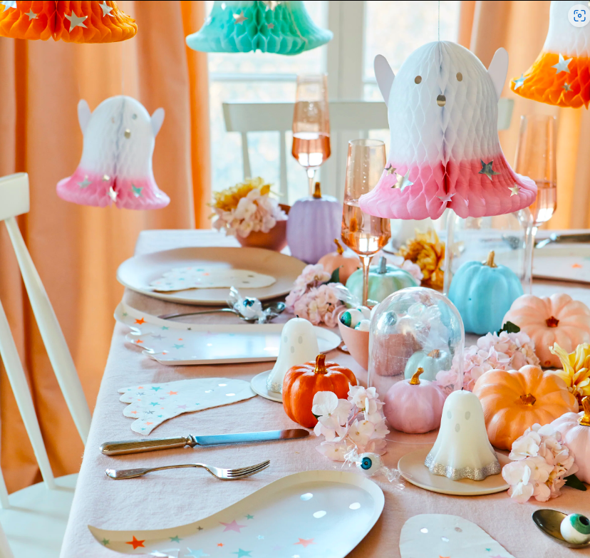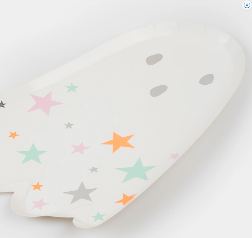 8 spaventosi piatti sagomati in cartoncino eco friendly a forma di fantasma con le stelline, perfetti per il tuo Halloween Party! Dimensione 24,8 x 24,1 cm.
