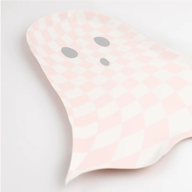Incredibili piatti sagomati a forma di fantasmino a quadretti, perfetti per il tuo Halloween Party. La confezione contiene 8 piatti in cartoncino eco friendly dimensione 25,7 x 23,5 cm.