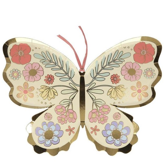 Piatti sagomati a forma di Farfalla colorata, perfetti per una festa a tema Principesse o un Tea Party. Elegantemente illustrato e realizzato, con splendidi dettagli in lamina d’oro. Sono realizzati in carta eco-friendly. La confezione contiene 8 piatti.