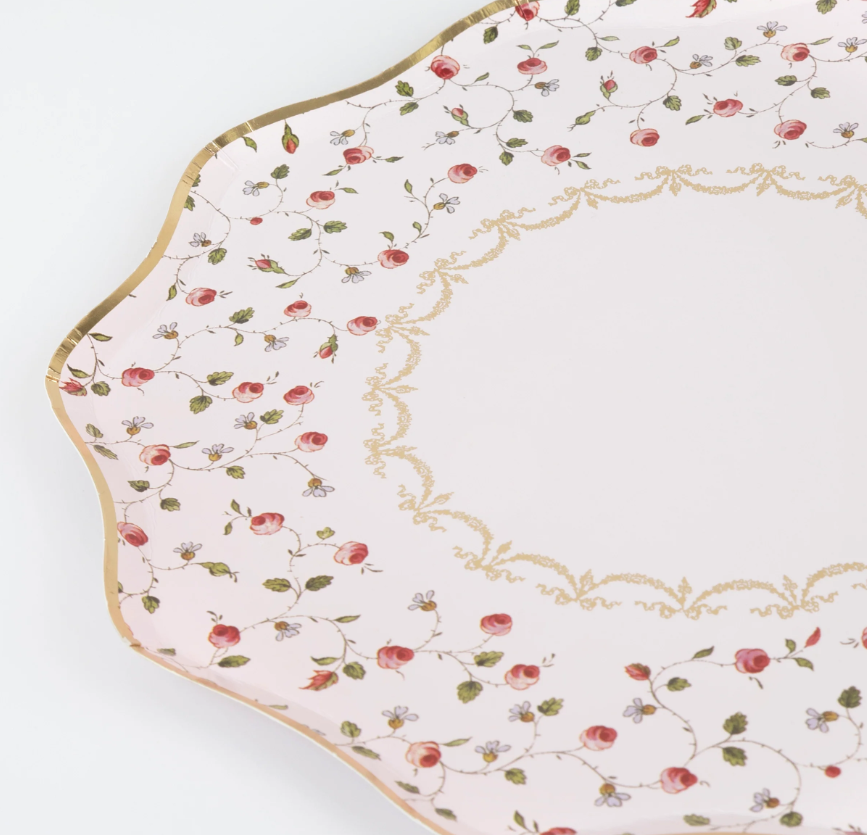 8 meravigliosi piatti in cartoncino eco friendly rosa con rose rosse e dettagli oro, realizzati in collaborazione con Laduree Paris, perfetti per il tuo party elegante e raffinato! Dimensione 26,7 x 26,7 cm.