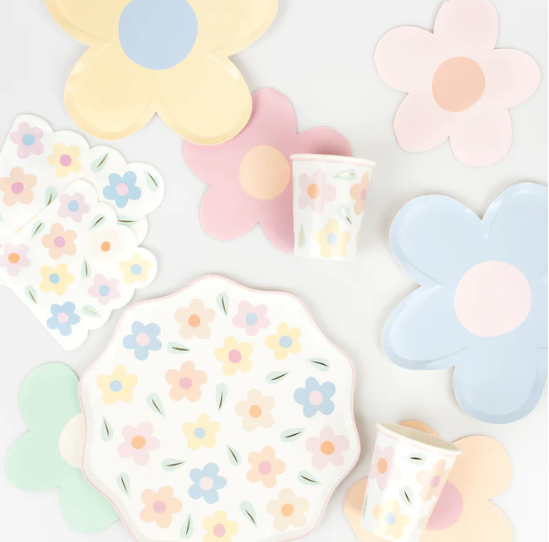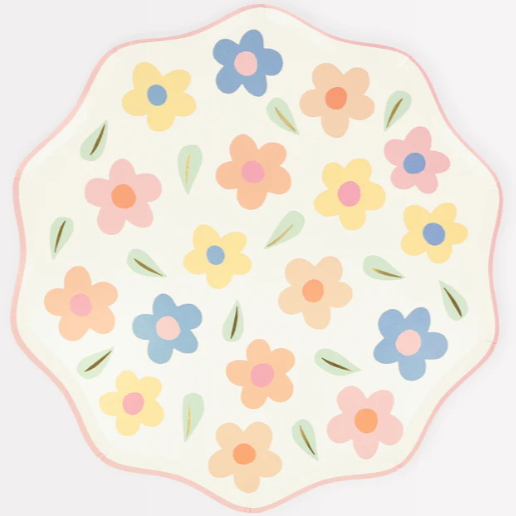 Meravigliosi piatti in cartoncino con fiorellini nei toni pastello e bordo ondulato, perfetti per un party in giardino! La confezione contiene 8 piatti in cartoncino eco friendly dimensione 26,7 x 26,7 cm.