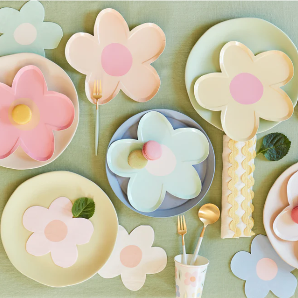 8 fantastici piatti sagomati in cartoncino a forma di margherite pastello, perfetti per un party in giardino! Dimensione 23,5 x 22,2 cm.