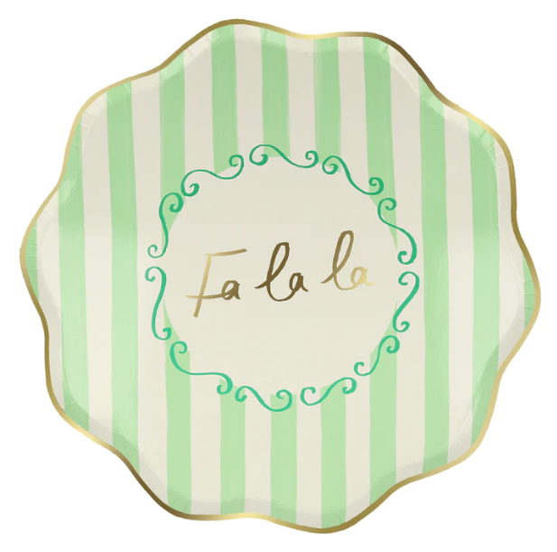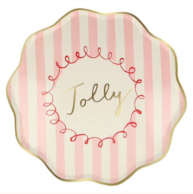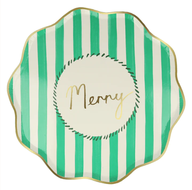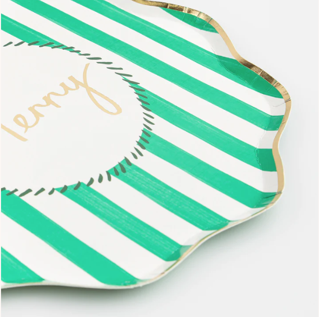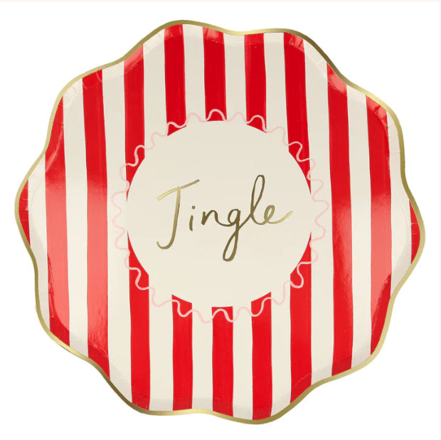 Meravigliosi piatti natalizi con bordo ondulato oro e righe in 4 colori diversi. Al centro poi ci sono 4 scritte diverse in oro: Jingle, Fa la la, Jolly e Merry! Sono perfetti per la tua tavola di Natale!