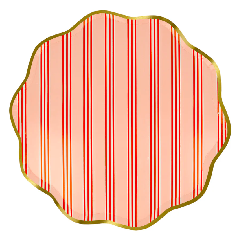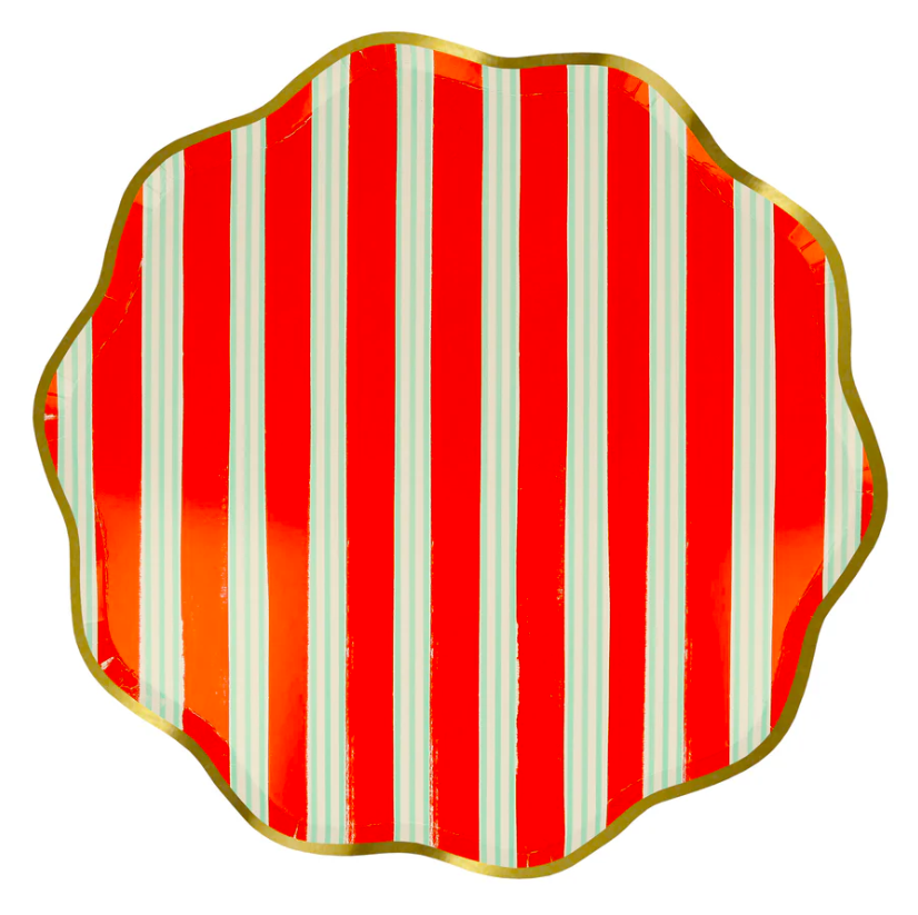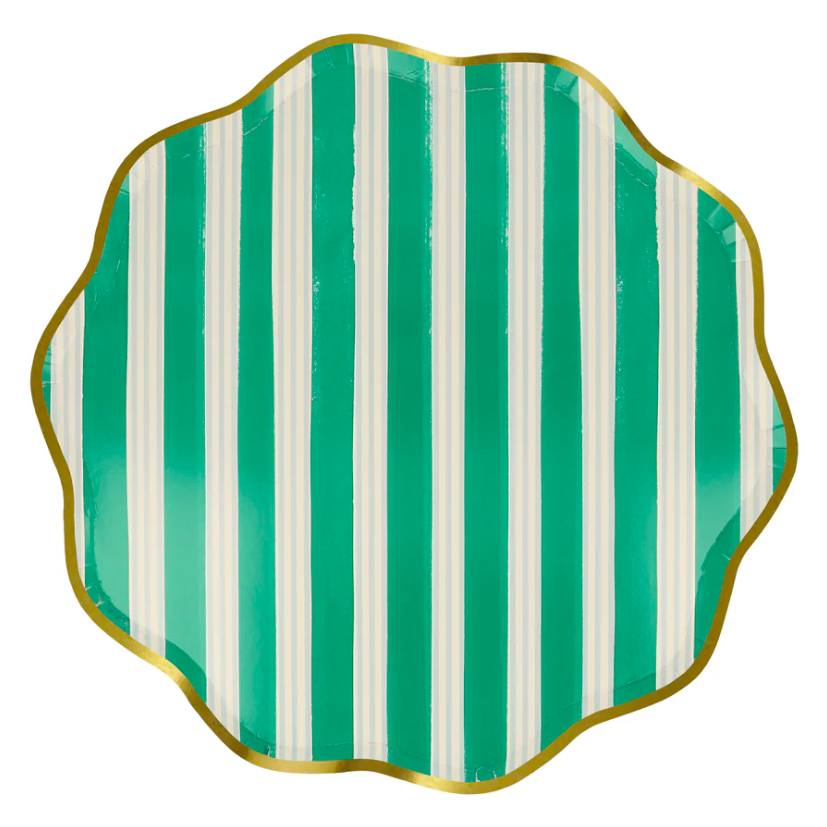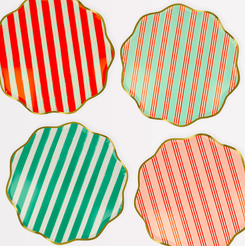 8 meravigliosi piatti in cartoncino eco friendly con strisce di diverse tonalità e dettagli oro, perfetti per la tua tavola di Natale! Dimensione 26,7 x 26,7 cm.
