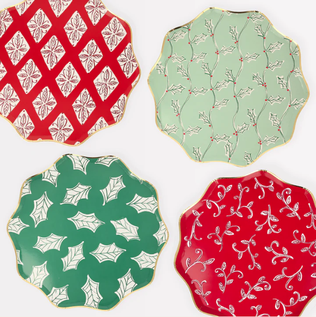 Perchè avere semplici piatti quando puoi avere questi splendidi piatti natalizi? La confezione contiene 8 piatti in cartoncino eco friendly in 4 design diversi. Dimensione 26,7 x 26,7 cm.