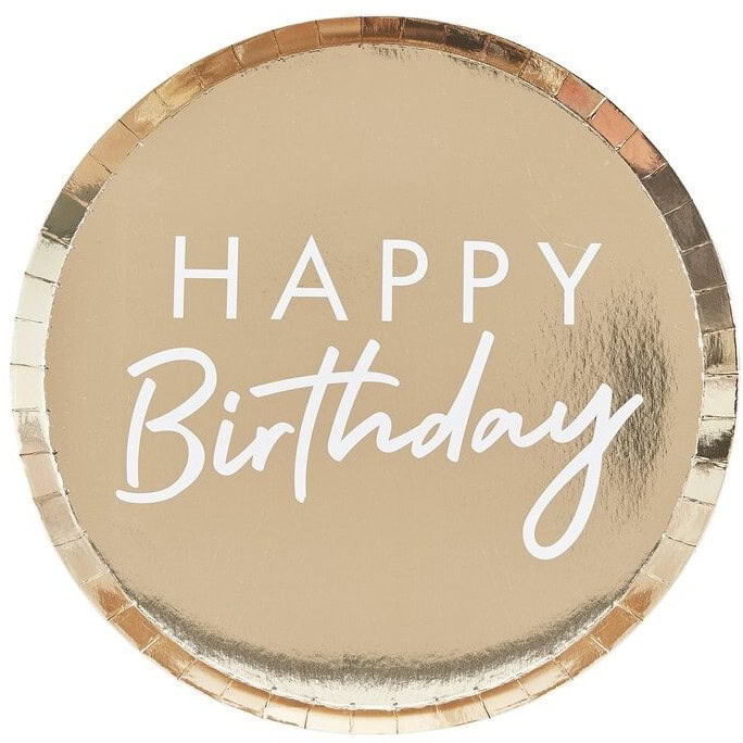 Splendidi piatti tondi Oro con scritta “Happy Birthday”, perfetti per sorprendere gli invitati al tuo Party! La confezione contiene 8 piatti in cartoncino dimensione 24 cm (H) x 24 cm.