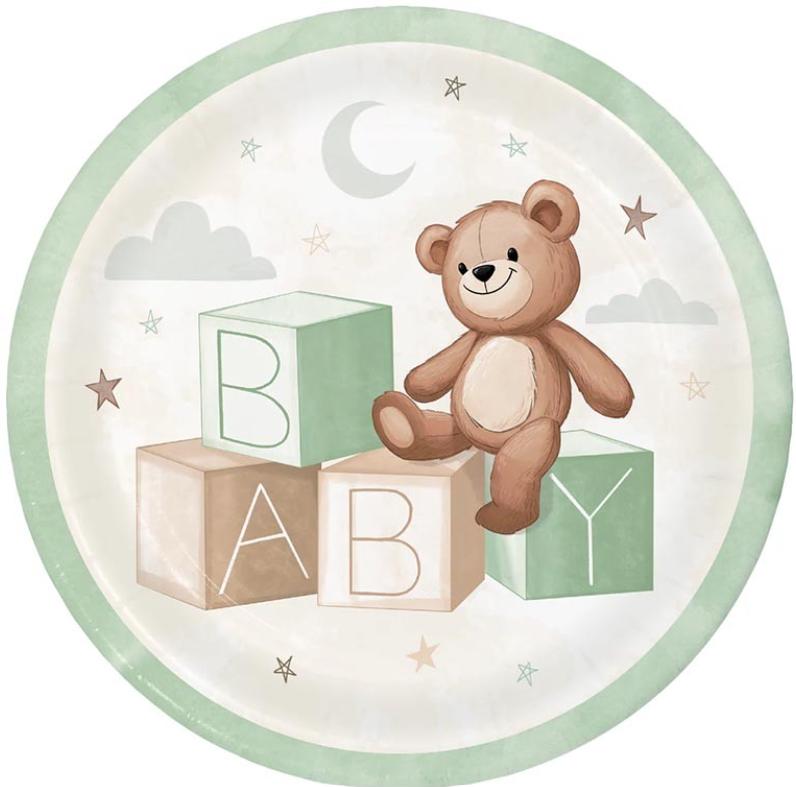 8 Adorabili piatti in cartoncino riciclabile nelle tonalità del verde menta pastello con un dolcissimo orsetto e la scritta “baby”. Perfetti per festeggiare un Baby Shower o una Nascita! Diametro 23 cm.