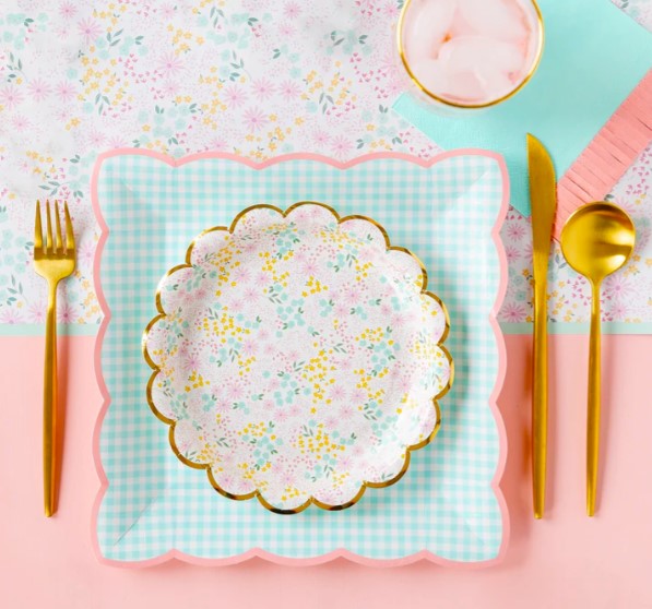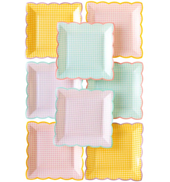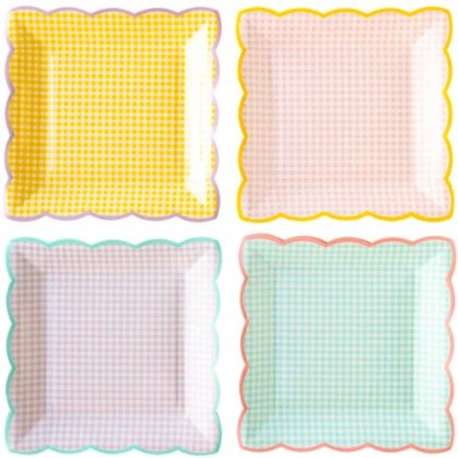 8 meravigliosi piatti in cartoncino a quadretti con bordo ondulato in 4 splendide tonalità pastello, perfetti per un party primaverile super colorato! Dimensione 22,8 x 22,8 cm.