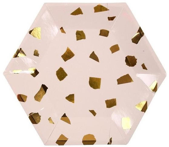 Splendidi Piatti Rosa Pastello con macchie Oro, perfetti per il tuo Party elegante e raffinato! La confezione contiene 8 piatti in carta di alta qualità, impreziosita da una lamina d’oro lucido. Dimensioni prodotto: 254mm x 222mm