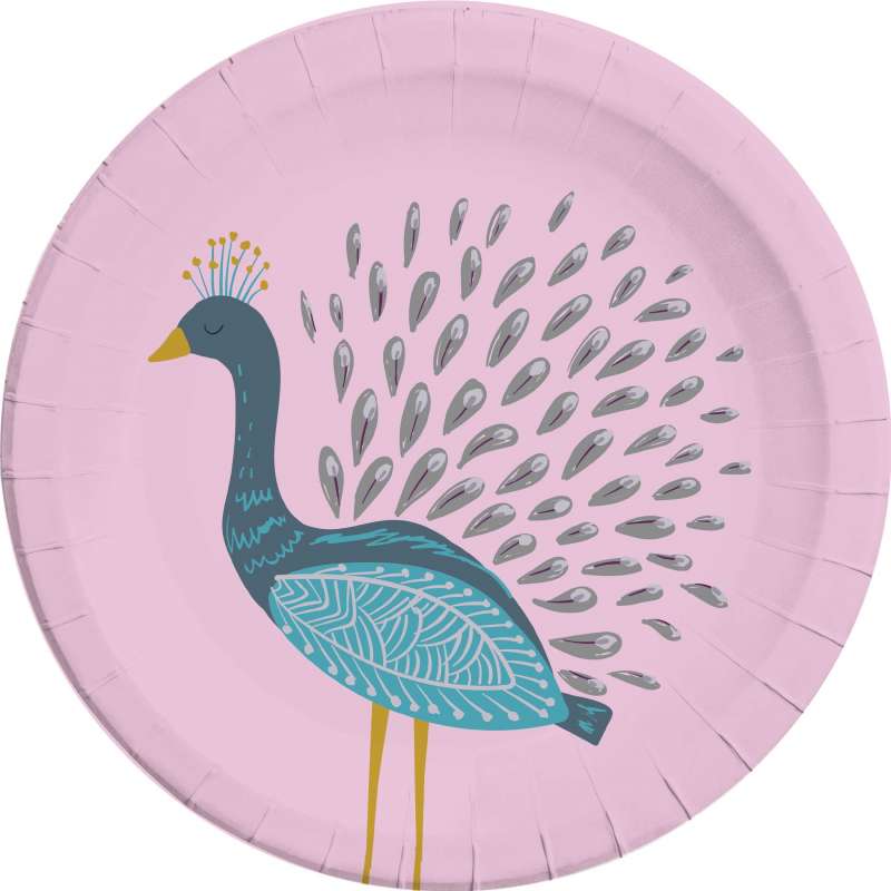 Piatti rosa con Pavone, perfetti per il tuo Party super originale! La dimensione è 23 cm, sono in cartoncino e la confezione contiene 8 piatti.