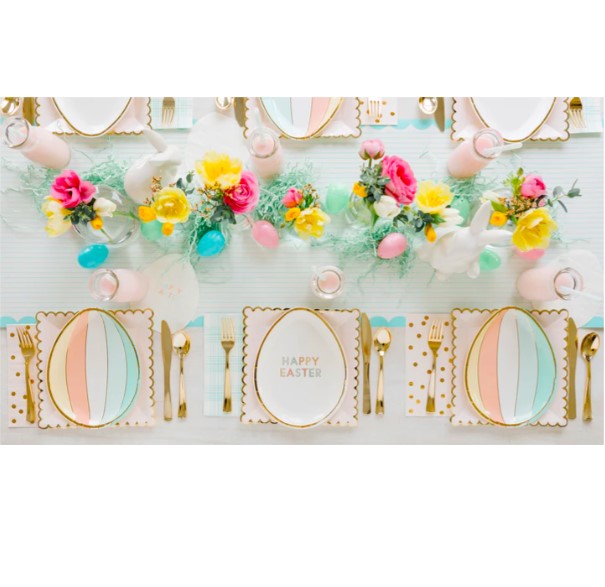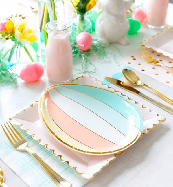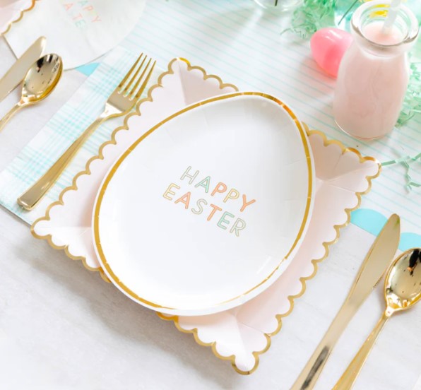 8 incredibili piatti sagomati in cartoncino a forma di uovo in 2 diversi design, uno a strisce pastello e l’altro con scritta “Happy Easter”, entrambi con meravigliosi dettagli oro…sono perfetti per la tua tavola di Pasqua! Dimensione circa 17 cm x 22,8 cm.