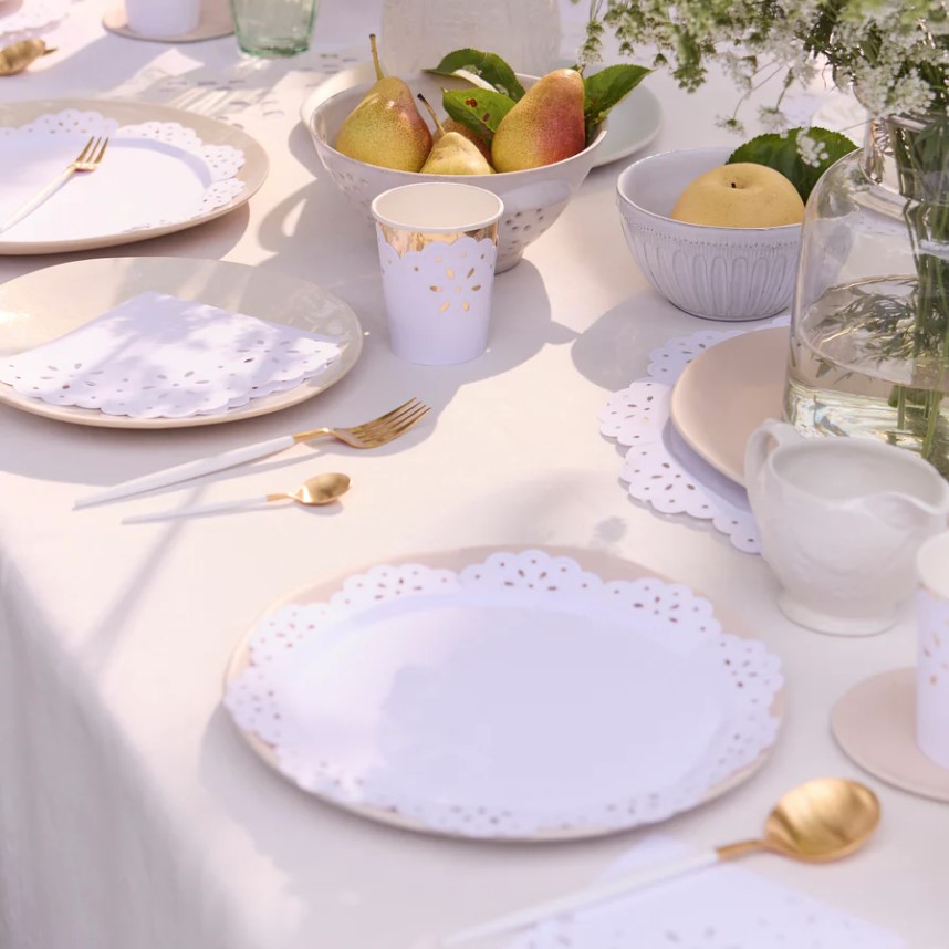 8 meravigliosi piatti in cartoncino che si ispirano al design in pizzo Broderie Anglaise con dettagli unici in rilievo, perfetti per il tuo evento raffinato ed elegante! Puoi utilizzarli sia come piatti, che come vassoi o sottopiatti. Dimensione 33,7 x 33,7 cm.