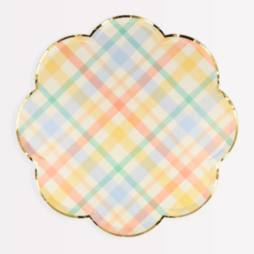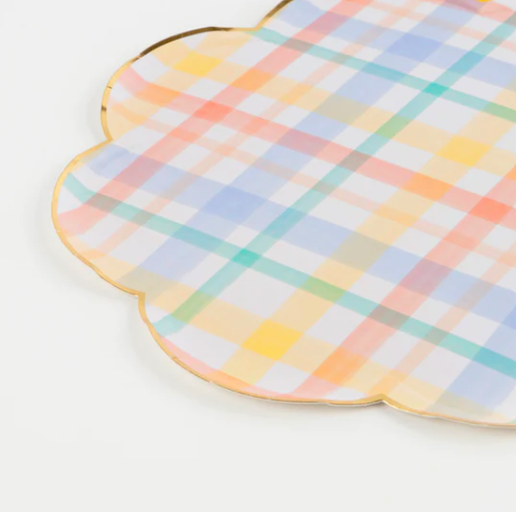 Incredibili piattini a righe pastello con bordo oro, perfetti per il tuo Party primaverile super colorato ed originale! La confezione contiene 8 piattini in carta eco friendly dimensione 21,6 x 21,6 cm.