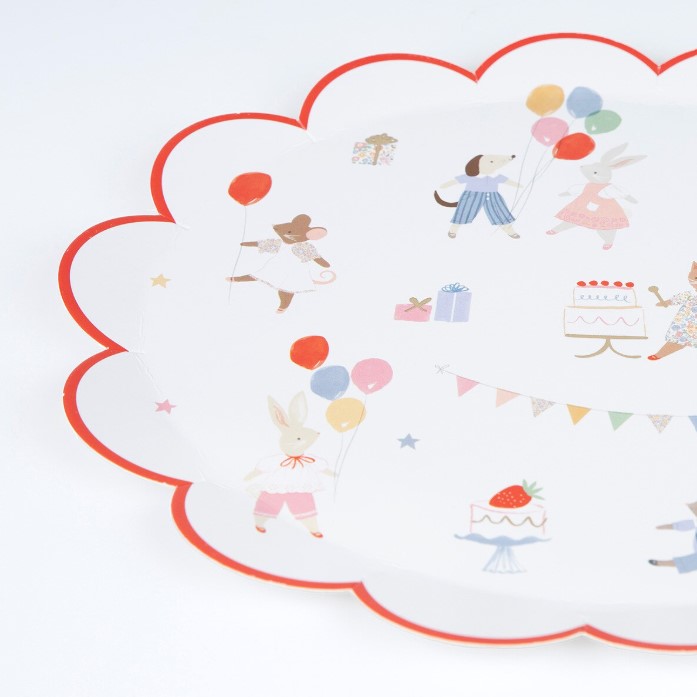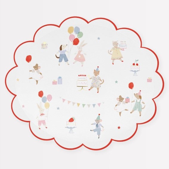 8 splendidi piattini in cartoncino con divertenti illustrazioni a tema animali e bordo smerlato rosso, perfetti per un compleanno super originale! Dimensione 22,5 x 21,3 cm.