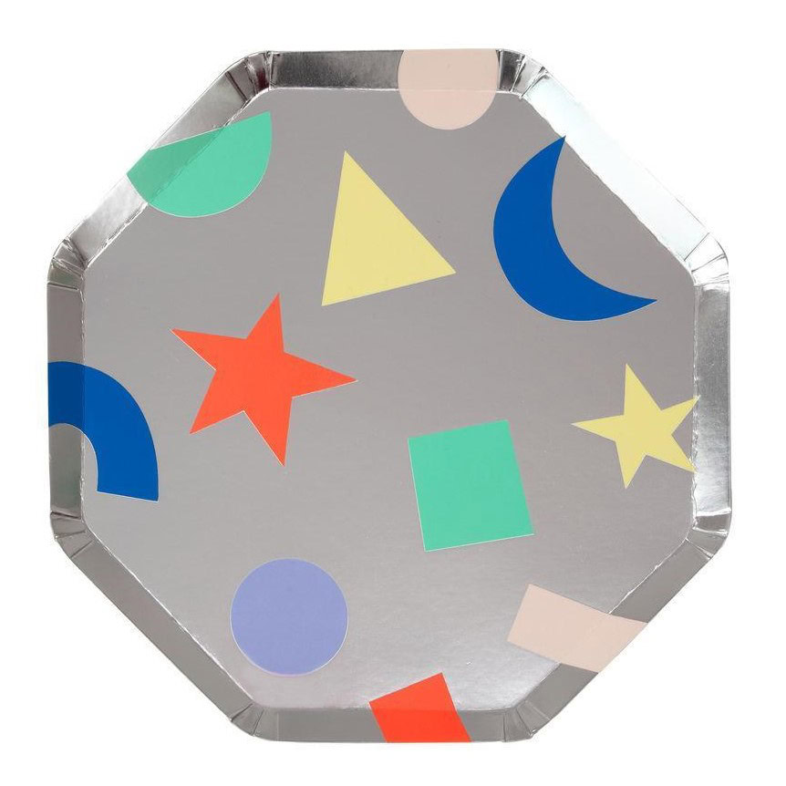 Piatti color Argento con forme geometriche colorate, perfette per il tuo Party originale e colorato! La confezione contiene 8 piatti in carta.