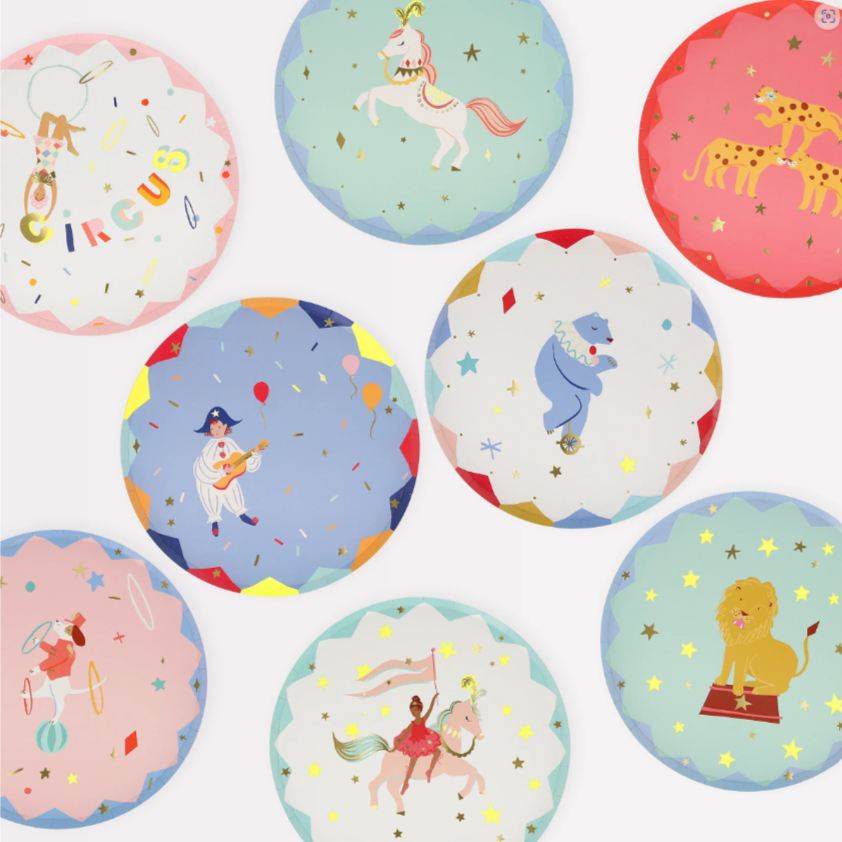 8 incredibili piattini in cartoncino eco friendly a tema circo, perfetti per un party super colorato e divertente! Dimensione 21,6 x 21,6 cm.