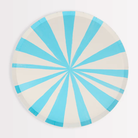 Incredibili piattini a strisce celesti e bianche, perfetti per il tuo party super colorato e divertente! La confezione contiene 8 piattini in cartoncino eco-friendly diametro 21,6 cm.
