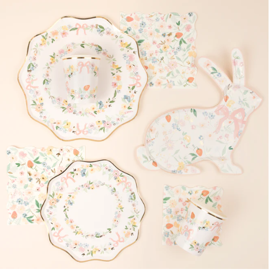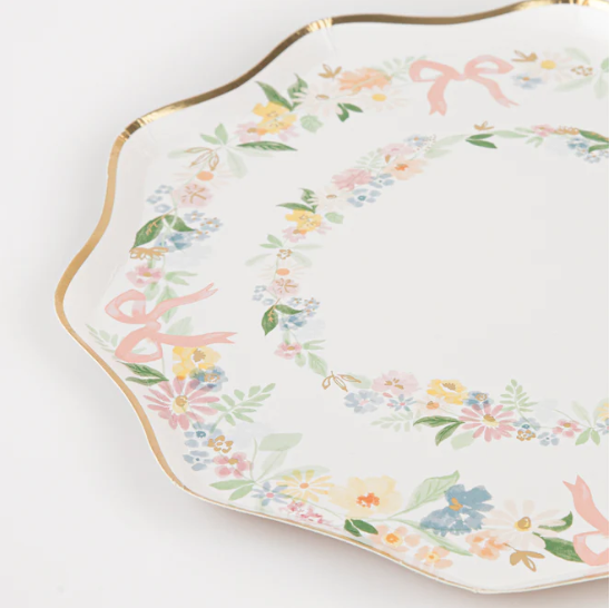 Meravigliosi piattini in cartoncino con fiori e fiocchetti dai toni pastello, perfetti per feste in giardino, addii al nubilato o qualsiasi celebrazione speciale!