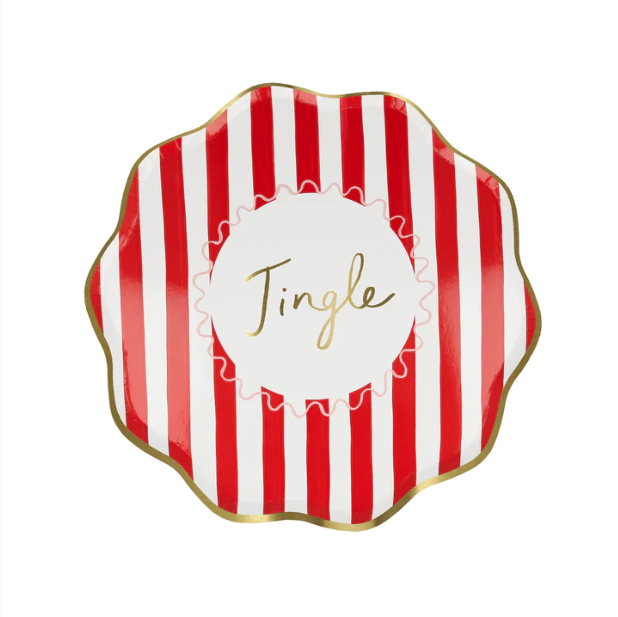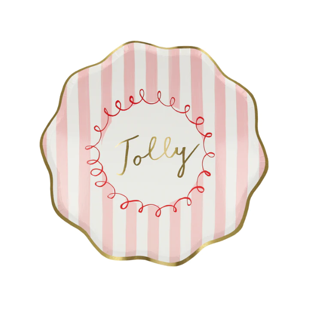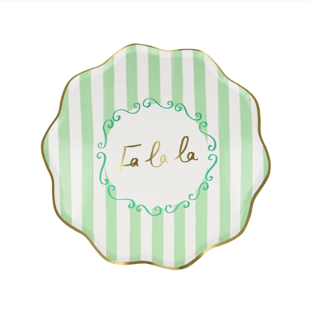 Meravigliosi piattini natalizi con bordo ondulato oro e righe in 4 colori diversi. Al centro poi ci sono 4 scritte diverse in oro: Jingle, Fa la la, Jolly e Merry! Sono perfetti per la tua tavola di Natale!
