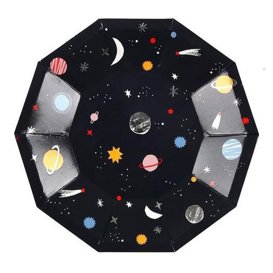 Fantastici Piattini a tema spazio, perfetti per il compleanno del tuo piccolo astronauta! La confezione contiene 8 piattini in carta splendidamente illustrati con pianeti e stelle, impreziositi da una lamina d’argento lucido.