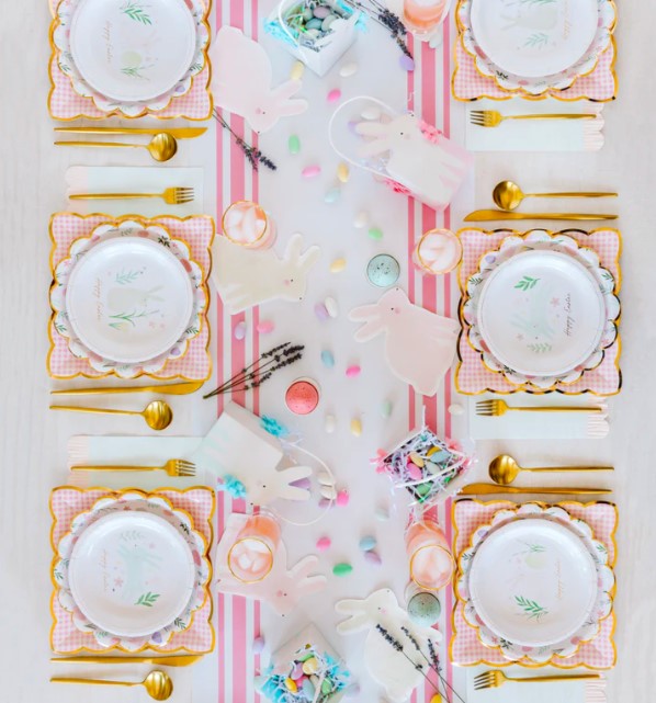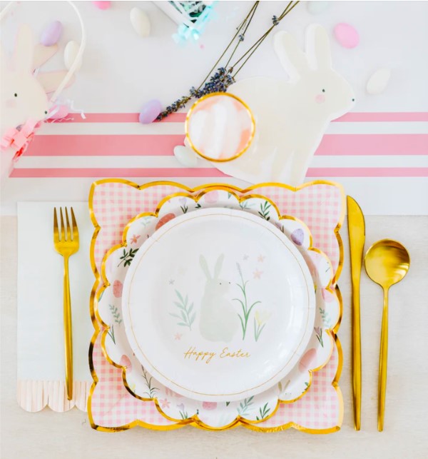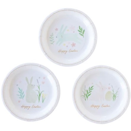 9 splendidi piattini in cartoncino con coniglietti in 3 design diversi e scritta “Happy Easter”, perfetti per la tua tavola di Pasqua! Dimensione 17,7 x 17,7 cm.
