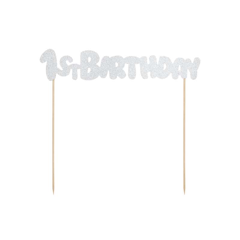 Cake Topper in Cartoncino Sagomato 1st Birthday colore Argento Glitter. Misure 20 cm x 21 cm con supporto in Legno. La confezione contiene 1 Cake Topper.