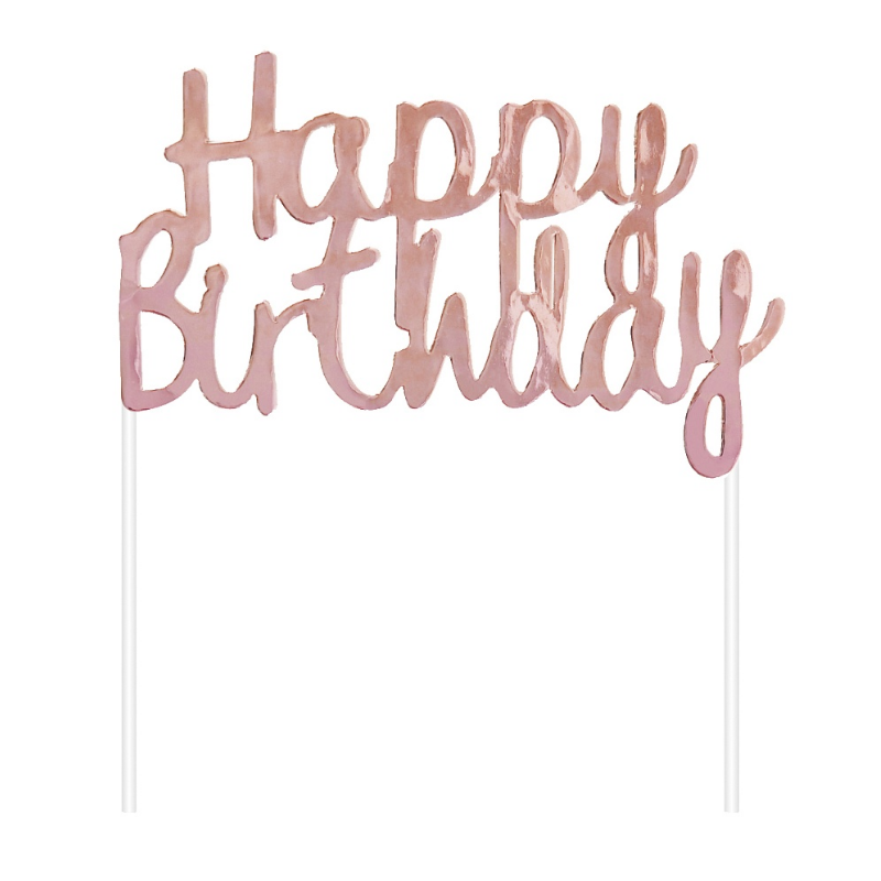 Cake Topper Sagomato Happy Birthday colore Rose Gold. Misure 11 cm x 11 cm con supporto in plastica. La confezione contiene 1 Cake Topper.