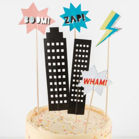 Favoloso Cake Topper con scritte dei fumetti, grattacieli e fulmini, perfetto per il tuo party a tema supereroi! Bastoncini di bambù.