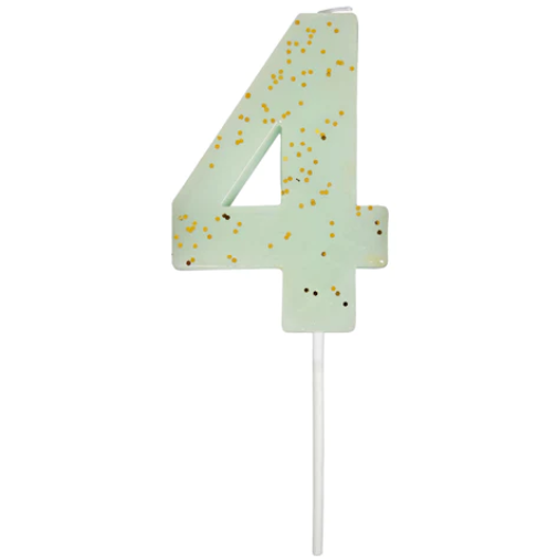 Meravigliosa candelina a forma di numero 4 verde menta con glitter oro, perfetta per la tua torta di compleanno super originale e colorata! Altezza 7,6 cm.