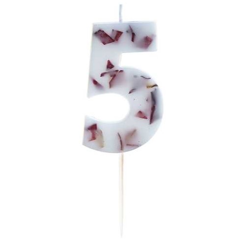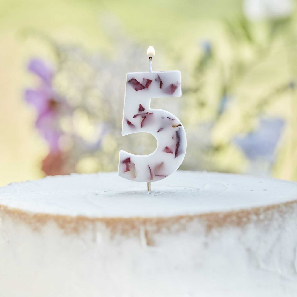 Splendida candela di compleanno con petali pressati, perfetta per il tuo Party a tema floreale! Dimensione 9 cm (altezza) x 4 cm (larghezza).