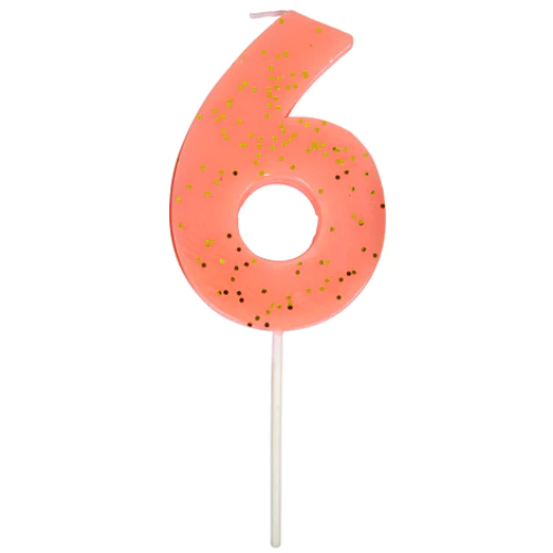 Meravigliosa candelina a forma di numero 6 corallo con glitter oro, perfetta per la tua torta di compleanno super originale e colorata! Altezza 7,6 cm.