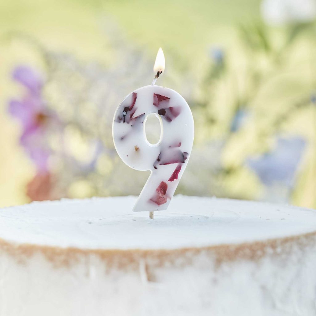 Splendida candela di compleanno con petali pressati, perfetta per il tuo Party a tema floreale! Dimensione 9 cm (altezza) x 4 cm (larghezza).