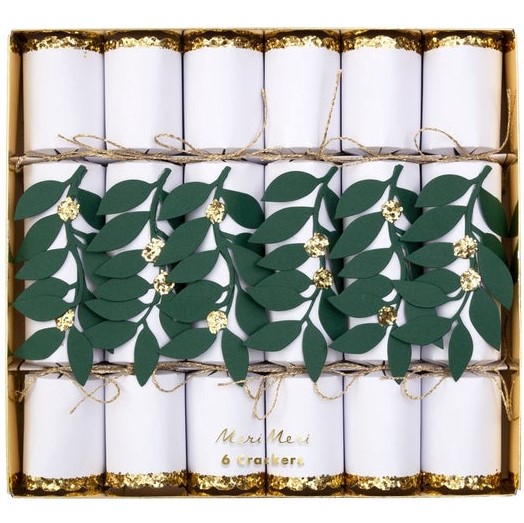 Eleganti Christmas Crakers bianchi con foglie e dettagli oro! La confezione contiene 6 Crakers splendidamente realizzati, perfetti come segnaposto o regalino!