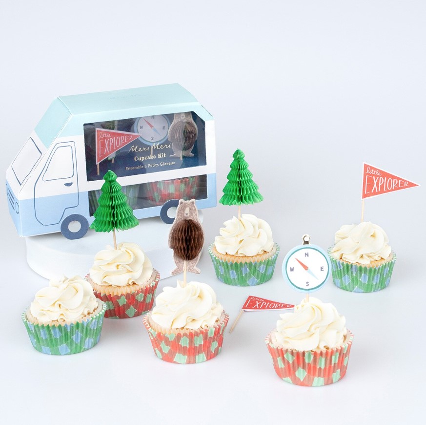 Fantastico kit per cupcakes con una incredibile confezione a forma di camper, 24 pirottini e 24 topper perfetti per un party a tema campeggio! Dimensione della scatola: 6,4 x 3,2 x 6,4 cm.