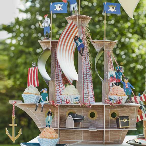 Incredibile kit per cupcakes a tema Pirati con una fantastica confezione a forma di nave! Packaging realizzato con carta ecologica